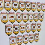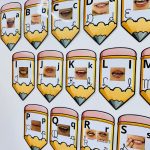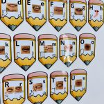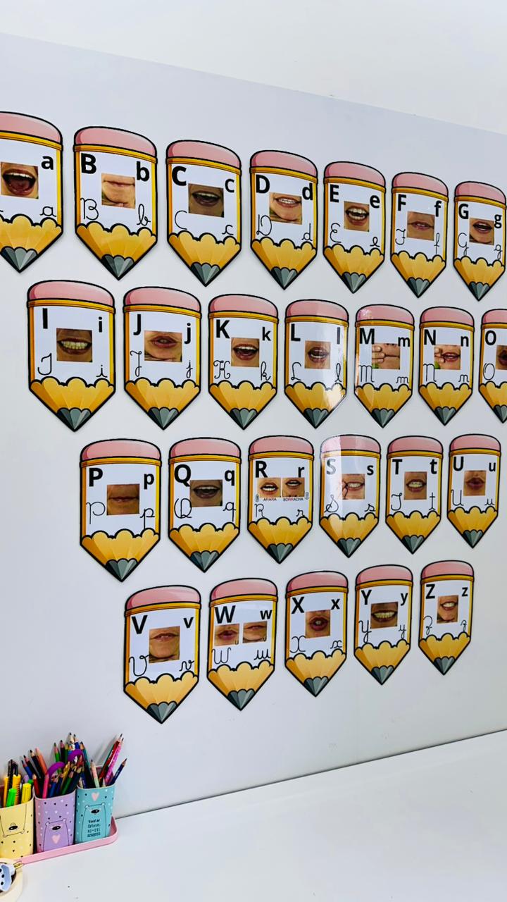 Cada letra do alfabeto é apresentada em formato de lápis, contendo: