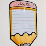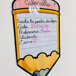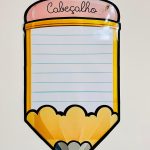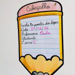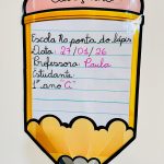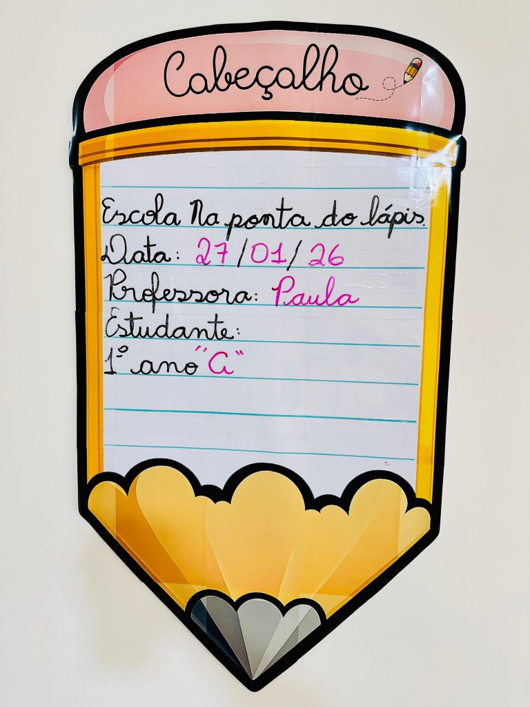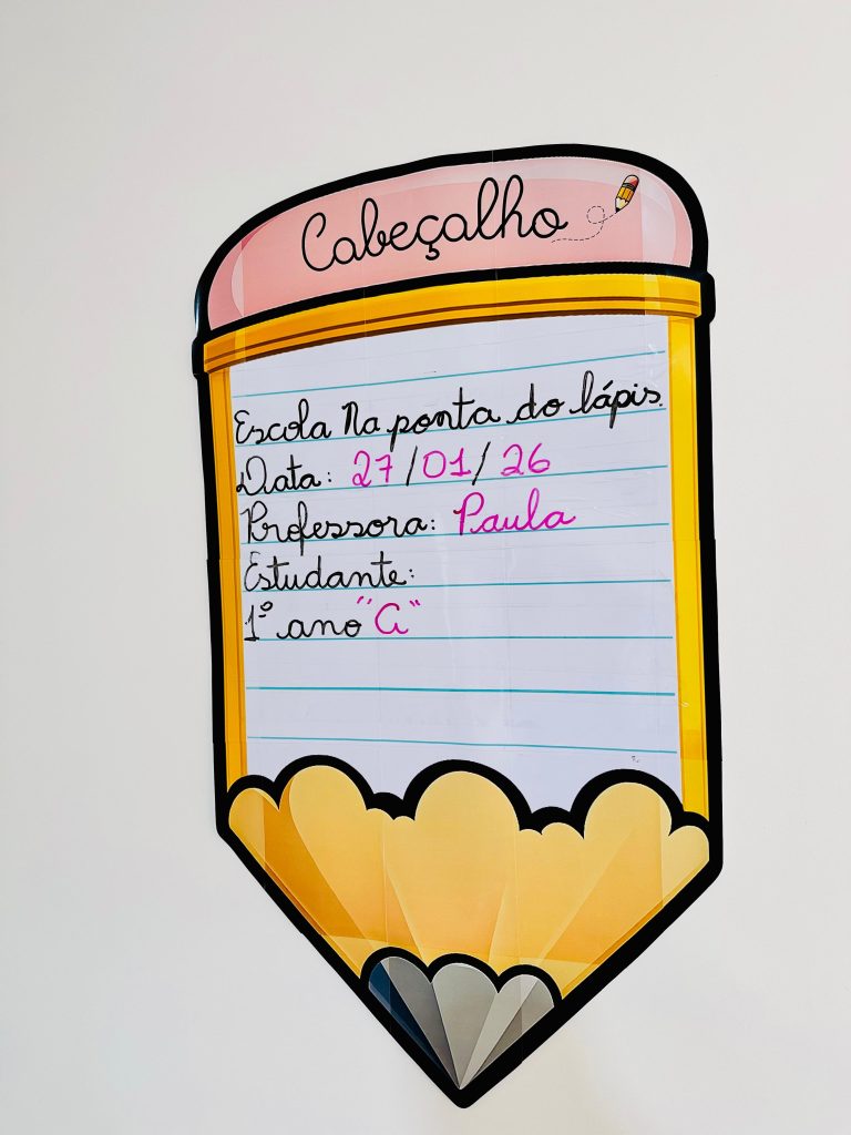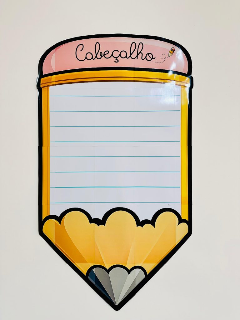 Arquivo em formato de lápis, ideal para ficar exposto ao lado do quadro, servindo como apoio diário para o cabeçalho durante a aula.