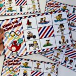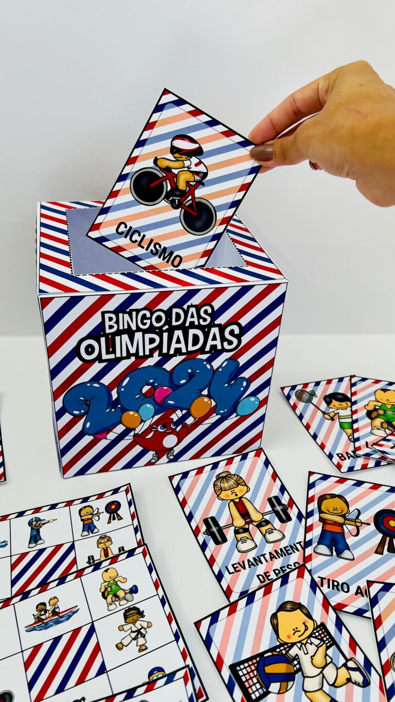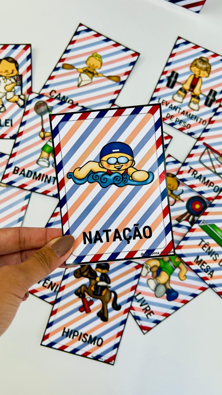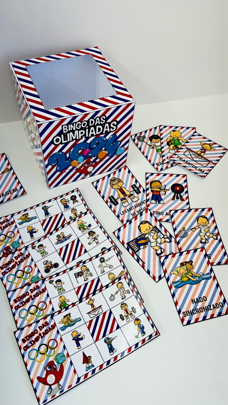São 26 cartelas com os esportes olímpicos e 22 fichas para sorteio.
