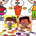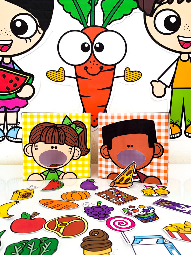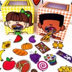 Caixinhas para separação de alimentos saudáveis e não saudáveis, e fichas de alimentos para separação