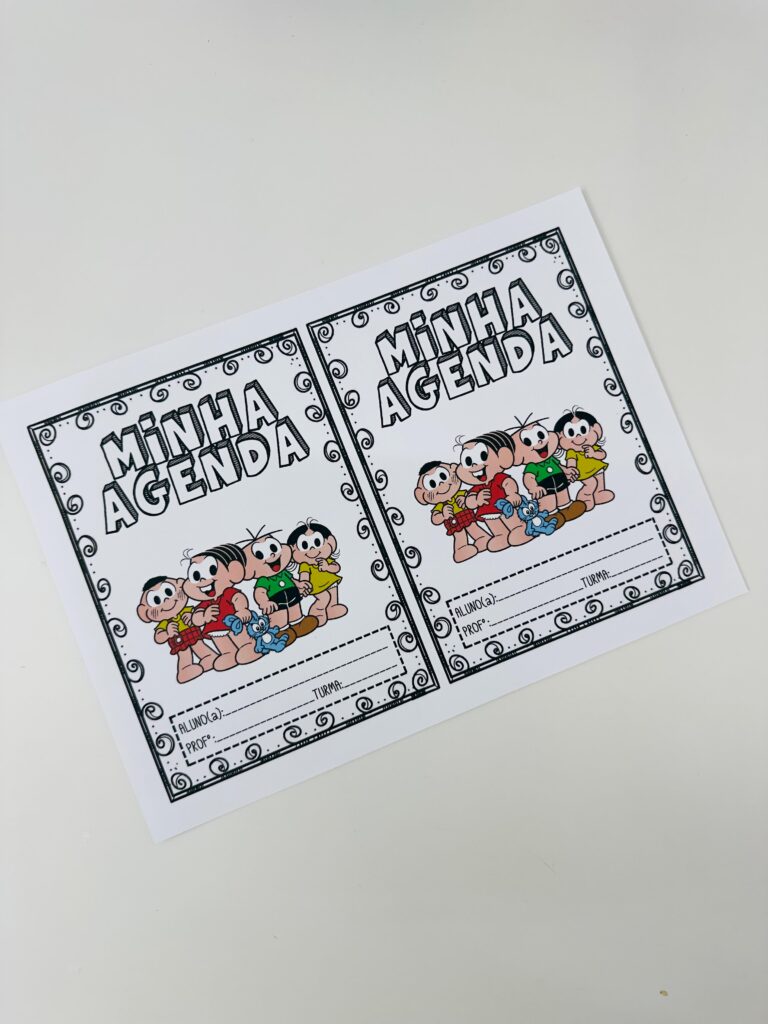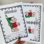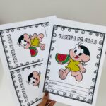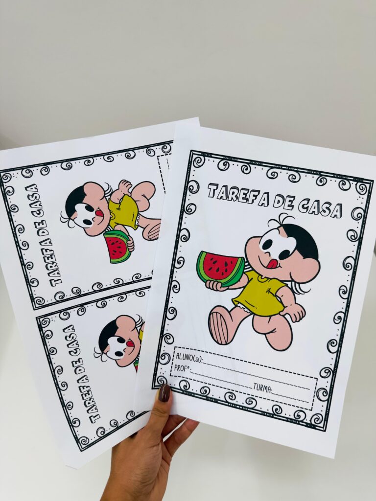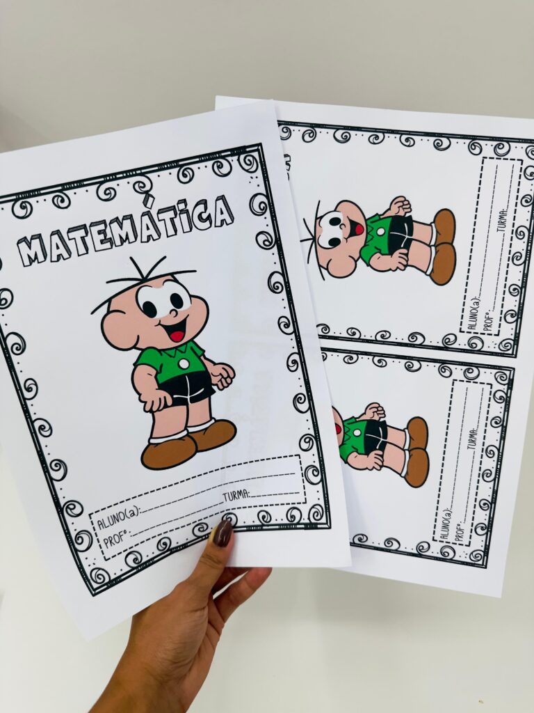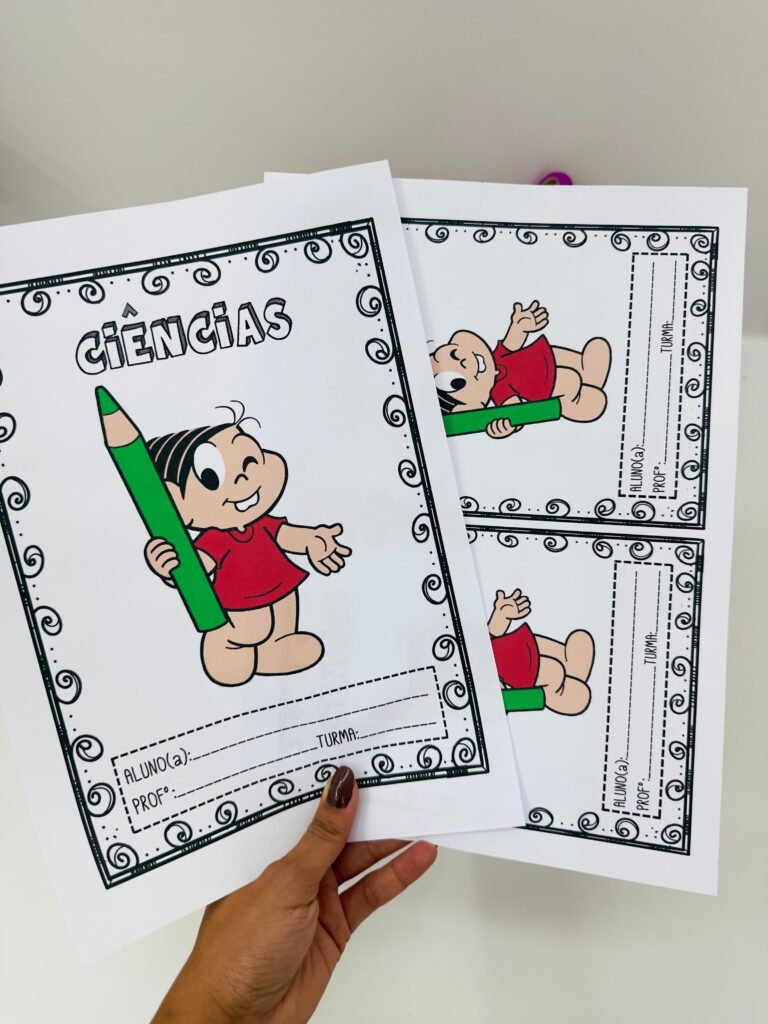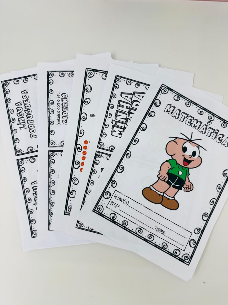 15 capas de caderno (Língua Portuguesa, inglês, matemática, raciocínio lógico, história, geografia, ciências, produção de texto, ortografia, ditado, interdisciplinar, tarefa de casa, tarefa de sala, espanhol, artes, natureza e sociedade)
