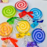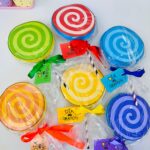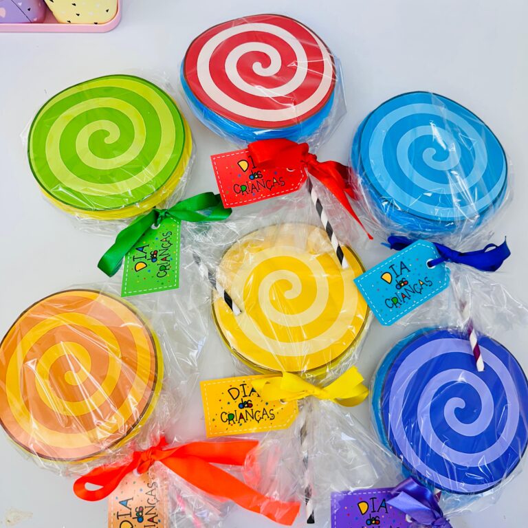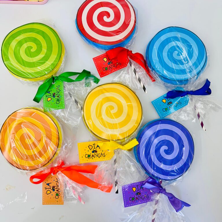 O kit contém os moldes dos pirulitos em 6 cores diferentes 🌈 (vermelho, laranja, amarelo, verde, azul e roxo) e também as tags personalizadas 🎀 para completar a lembrancinha.