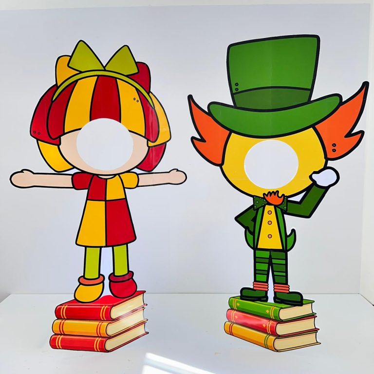 Os bonecos são montados folha por folha, formando um banner grande e chamativo.