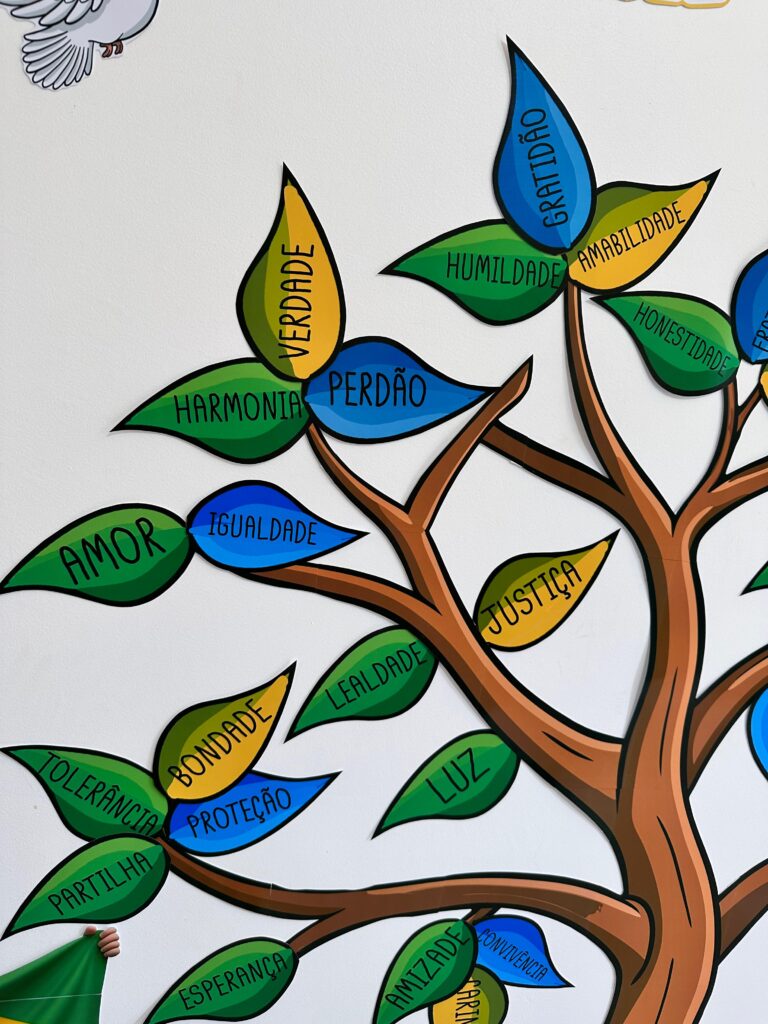 O arquivo com: 52 folhas, contendo: A árvore da paz, as crianças, e as folhas coloridas contendo palavras que representam valores essenciais para a construção de um Brasil melhor.
