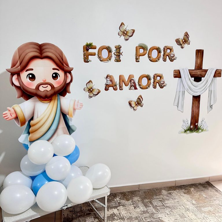 Celebre o verdadeiro significado da Páscoa com este lindo painel Páscoa Cristã “Foi por Amor”, perfeito para decorar salas de aula, igrejas ou espaços educativos durante o período pascal.