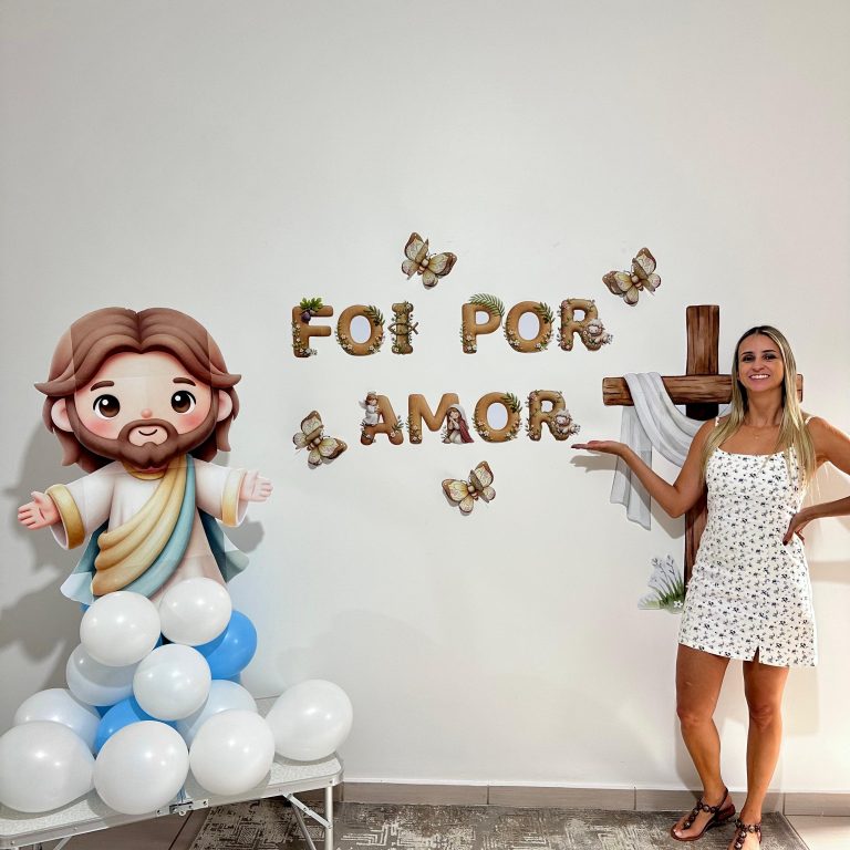 O arquivo acompanha todas as letras da frase “FOI POR AMOR”, além dos elementos ilustrados que compõem a decoração do painel, permitindo montar um cenário completo e impactante.