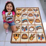 A criança joga o dado e, ao observar a imagem que saiu, deve pular no tapete interativo até encontrar a figura correspondente.